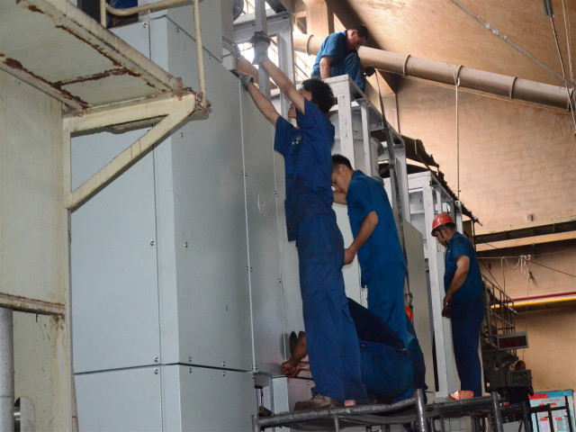 圖為施工人員對設(shè)備進(jìn)行安裝工作。