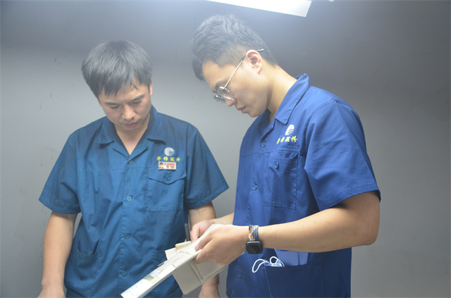 花布車間現場主管紀方超(右)與焙烘機機長孫海雷,在查看金粉印花生產質量。