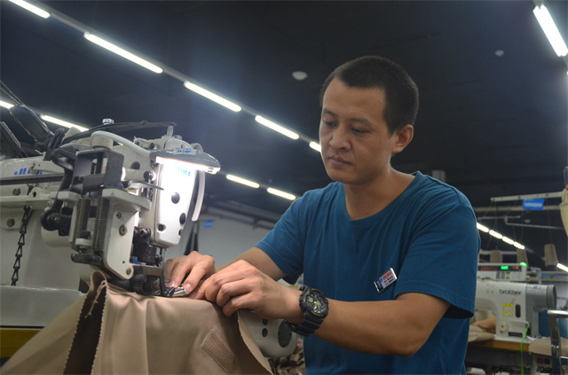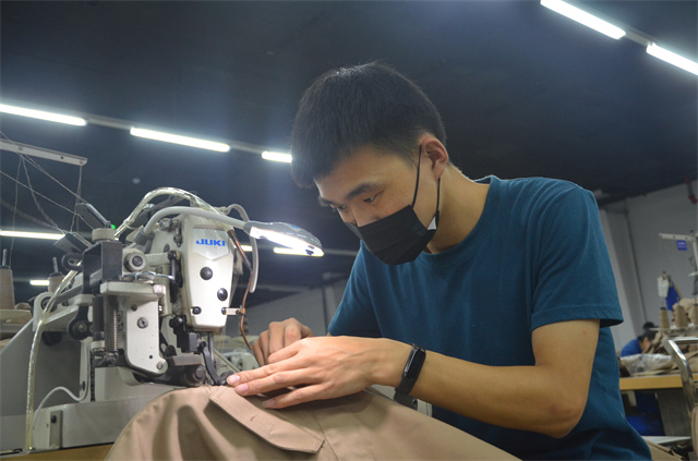 服裝車間縫制二班多能工郭叢叢進入公司10年來,靠著不斷追求精進,成長為對服裝生產各環(huán)節(jié)駕輕就熟的“老把式”。