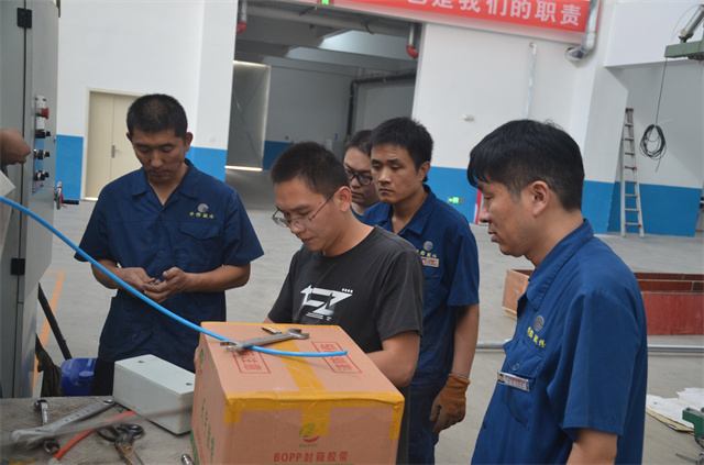 家紡車間卞兆穩(wěn)(右一)等人,正在為印花機安裝新配件。