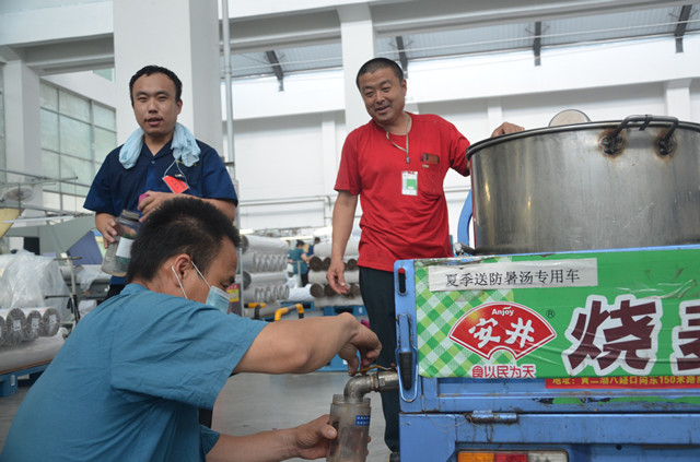 圖為6月20日公司向生產(chǎn)一線發(fā)送綠豆湯和西紅柿雞蛋湯的情形。