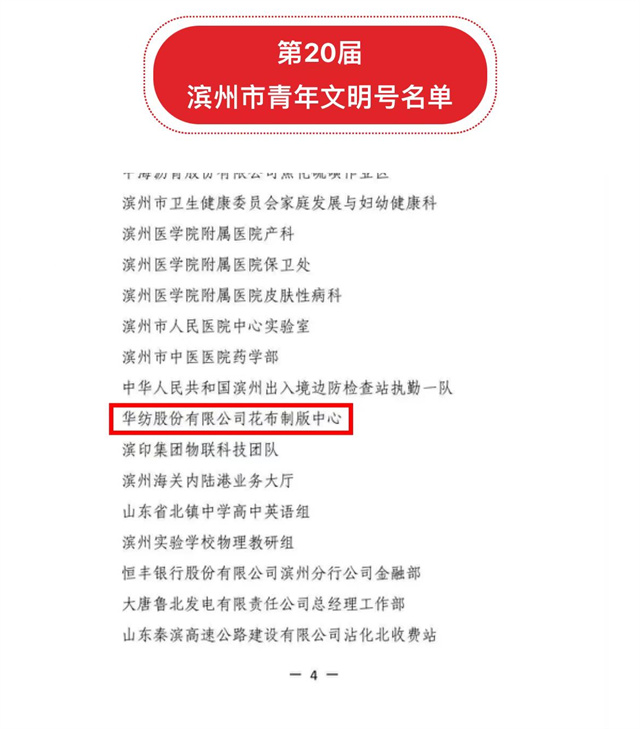 導讀:11月8日,濱州市創(chuàng)建青年文明號活動組委會發(fā)布《關于命名第20屆“濱州市青年文明號”的決定》,經(jīng)逐級認定、嚴格審核、社會公示,公司花布制版中心獲第20屆“濱州市青年文明號”