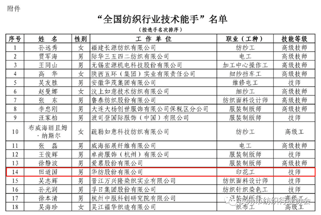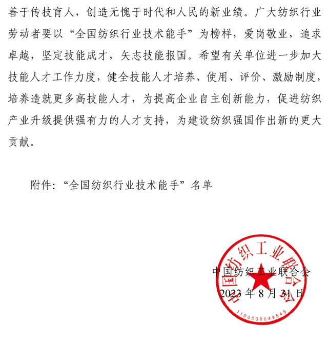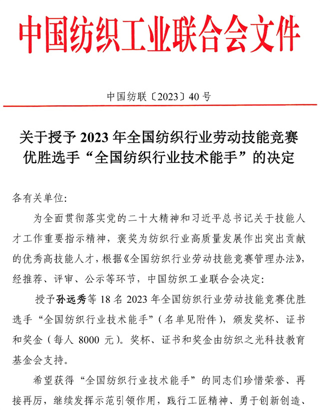 導(dǎo)讀:近日,中國紡織工業(yè)聯(lián)合會發(fā)布了授予在2023年全國紡織行業(yè)勞動技能競賽中取得前18名的紡織企業(yè)員工為“全國紡織行業(yè)技術(shù)能手”榮譽稱號的決定,