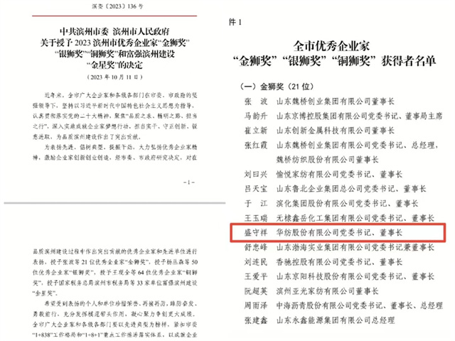 會(huì)上,對(duì)在品質(zhì)濱州建設(shè)過(guò)程中作出突出貢獻(xiàn)的優(yōu)秀企業(yè)家和先進(jìn)單位進(jìn)行了表彰頒獎(jiǎng),公司黨委書記、董事長(zhǎng)盛守祥先生榮獲2023濱州市優(yōu)秀企業(yè)家“金獅獎(jiǎng)”。
