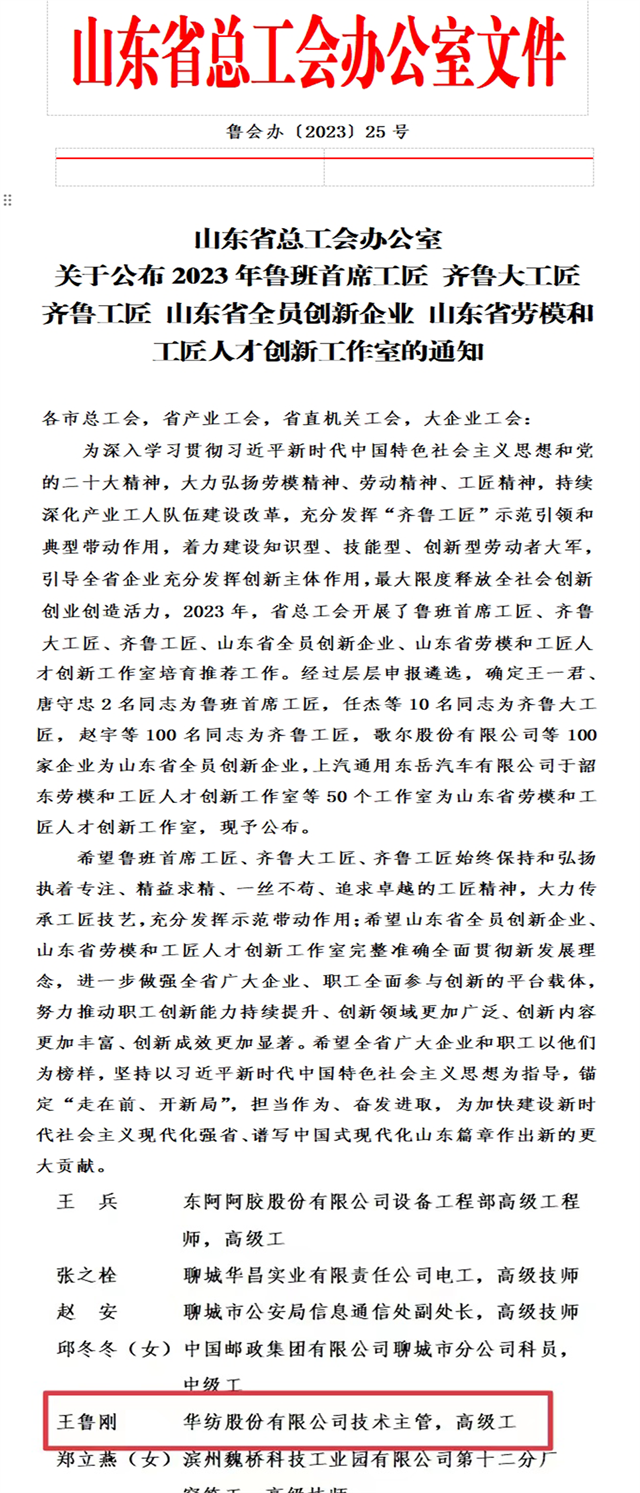 近日,省總工會下發(fā)通知,公布了多項獲獎名單,其中,公司面料車間技術(shù)主管、高級工王魯剛榮獲第六屆“齊魯工匠”稱號。這是王魯剛繼獲“濱州工匠”、山東省“最佳創(chuàng)新(效益)能手”、“全國紡織行業(yè)技術(shù)能手”后的又一榮譽。