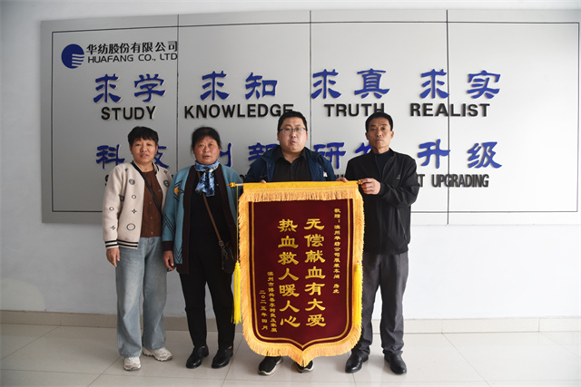 4月8日,服裝車間員工房虎收到了一面飽含深情的錦旗,上面寫著“無償獻血有大愛,熱血救人暖人心”。這面錦旗不僅是對房虎長期堅持無償獻血善舉的高度認可,更彰顯了華紡人熱心公益、奉獻社會的精神風(fēng)貌。