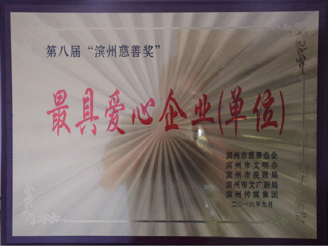 近日,由濱州市慈善總會、市精神文明建設委員會辦公室、市民政局、市文化廣電新聞出版局、濱州傳媒集團等聯(lián)合舉辦的第八屆“濱州慈善獎”評選表彰活動圓滿結束,公司以對慈善事業(yè)的突出貢獻,榮獲“最具愛心企業(yè)(單位)”稱號。