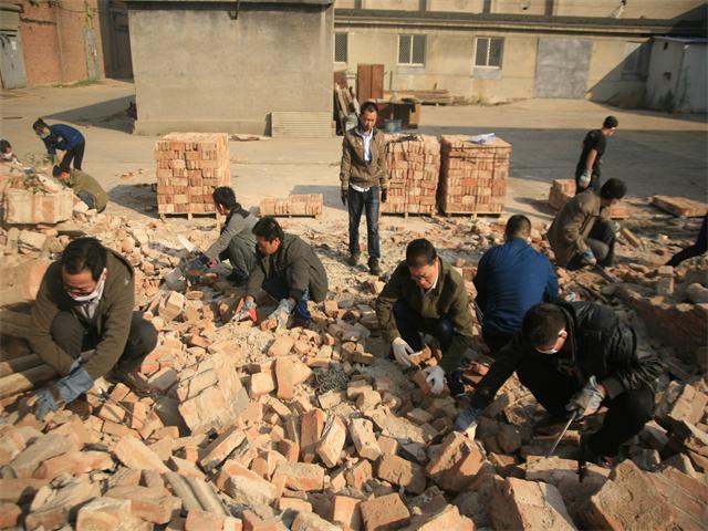 導(dǎo)讀:從10月10日開始,各主體車間及職能部室的部分員工下了班兒,相互約著來到現(xiàn)公司所屬的原經(jīng)編廠廠區(qū),對部分拆除后的房屋出現(xiàn)的紅磚進(jìn)行整理,以便再利用。