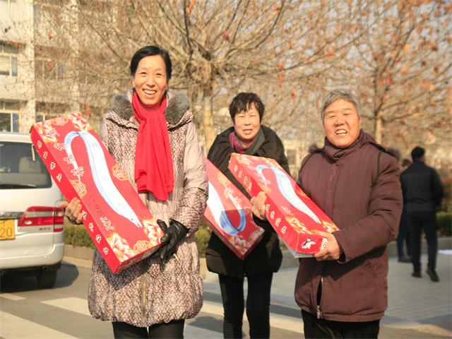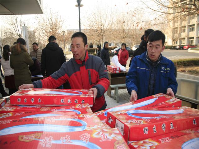 圖為員工領(lǐng)到春節(jié)慰問品時的情形。