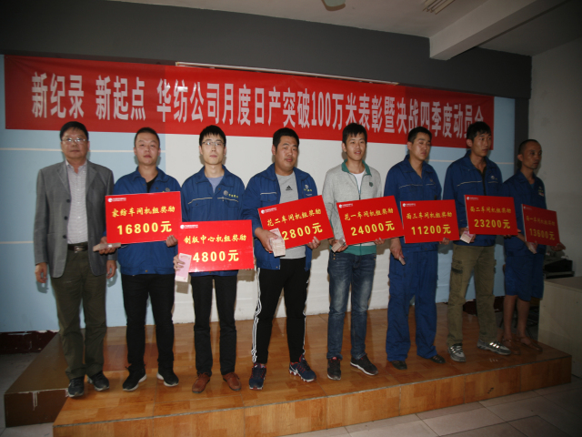 10月11日,公司召開主題為“新紀(jì)錄,新起點(diǎn),華紡公司月度日產(chǎn)突破100萬米表彰暨決戰(zhàn)四季度動(dòng)員會(huì)”,會(huì)上對(duì)在9月份印染生產(chǎn)計(jì)劃完成工作中成績優(yōu)異的55個(gè)機(jī)組和41位個(gè)人進(jìn)行了表彰獎(jiǎng)勵(lì),對(duì)第四季度工作進(jìn)行了部署。
