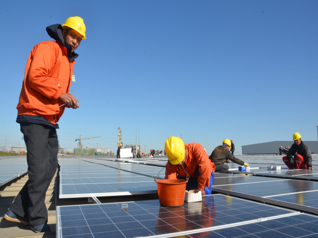 導(dǎo)讀:10月29日,一些工人正在公司工業(yè)園紡紗車間5萬多平方米的廠房房頂上,將一塊塊用于一期6MW光伏發(fā)電項目的光伏組件陸續(xù)安裝到位。